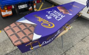 Gogoșa a fost cea mai recentă creație a verișorului lui Phil, Ross Hall, care conduce o afacere în Auckland, Noua Zeelandă, numită Dying Art, care construiește personalizat sicrie colorate. Alte creații ale lui Hall includ o barcă cu pânze, un camion de pompieri, un baton de ciocolată și blocuri Lego. Au fost sicriele strălucitoare acoperite cu bijuterii false, o sicriă inspirată din filmul „Matrix” și o mulțime de sicrie care descriu plajele și locurile de vacanță preferate ale oamenilor. „Există oameni care sunt mulțumiți de o cutie maro din mahon și este minunat”, a spus Hall. „Dar dacă vor să strige, sunt aici să fac asta pentru ei.” Ideea i-a venit pentru prima dată lui Hall acum aproximativ 15 ani, când scria un testament și își contempla propria moarte. „Cum vreau să ies?” s-a gândit în sine, hotărând că nu va fi ca toți ceilalți. „Așa că am pus în testament că vreau o cutie roșie cu flăcări pe ea”.