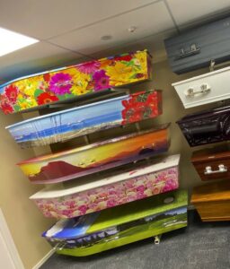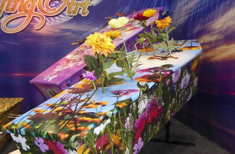 Sicrie colorate sunt de obicei îngropate sau incinerate împreună cu decedatul. Singurul pe care la primit înapoi este vărul său, a spus el, pentru că a folosit polistiren și spumă de modelat, care nu este ecologic.